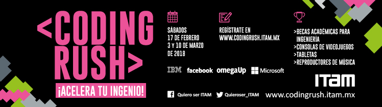 Image: Idioma EspañolRango de Publicación: Lunes, Enero 15, 2018 - 12:15 al Sábado, Febrero 17, 2018 - 12:15Link: Coding Rush ITAM