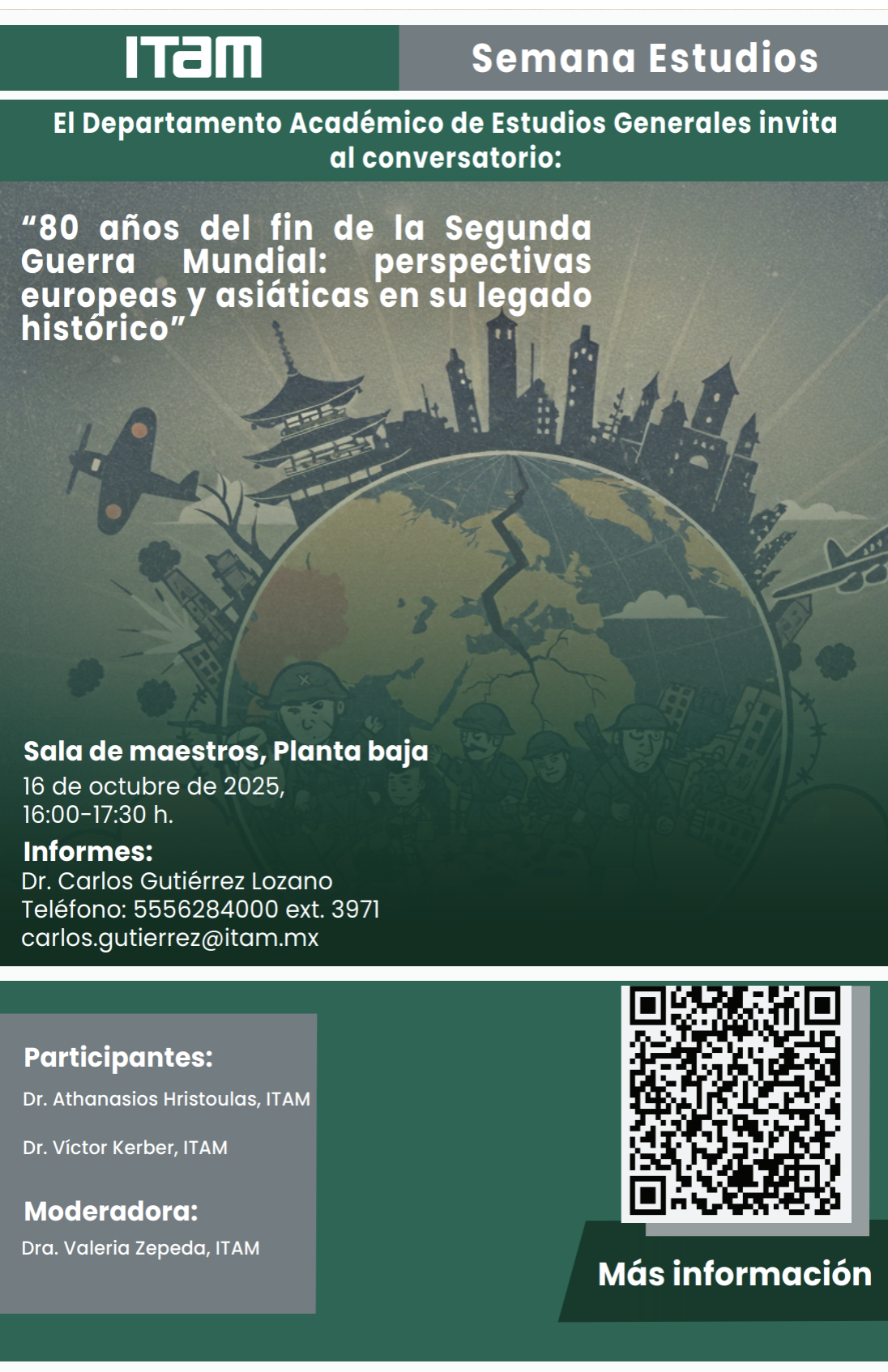 La conferencia “80 años del fin de la Segunda Guerra Mundial: perspectivas europeas y asiáticas en su legado histórico” propone una revisión amplia y comparativa de las huellas que dejó el conflicto más devastador del siglo XX en distintos contextos culturales. A ochenta años de su conclusión, el ponente invita a reflexionar sobre cómo Europa y Asia han elaborado, desde sus propias memorias colectivas, los procesos de reconstrucción, justicia y reconciliación.