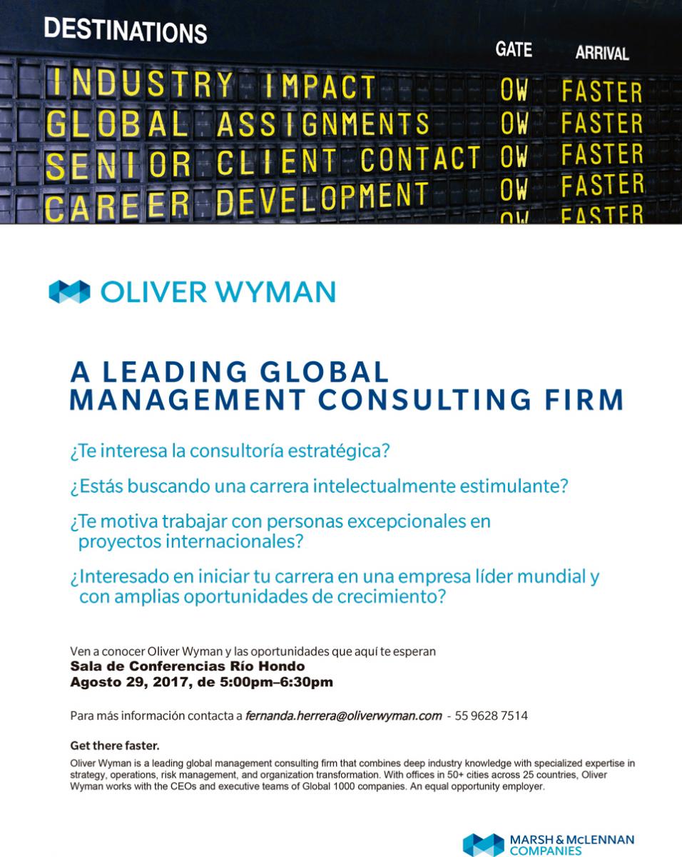 Oliver Wyman en conjunto con la Bolsa de Trabajo invita a su presentación, dirigida a alumnos de los 3 últimos semestres y recién graduados de todas las licenciaturas e ingenierías.