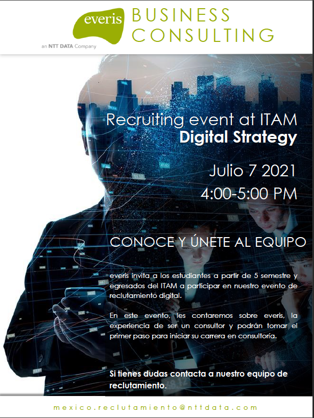Everis en conjunto con la Oficina de Career Services del ITAM te invita a su sesión de reclutamiento remota, dirigido a todos los alumnos a partir de 5º semestre y exalumnos de todas las licenciaturas e ingenierías.