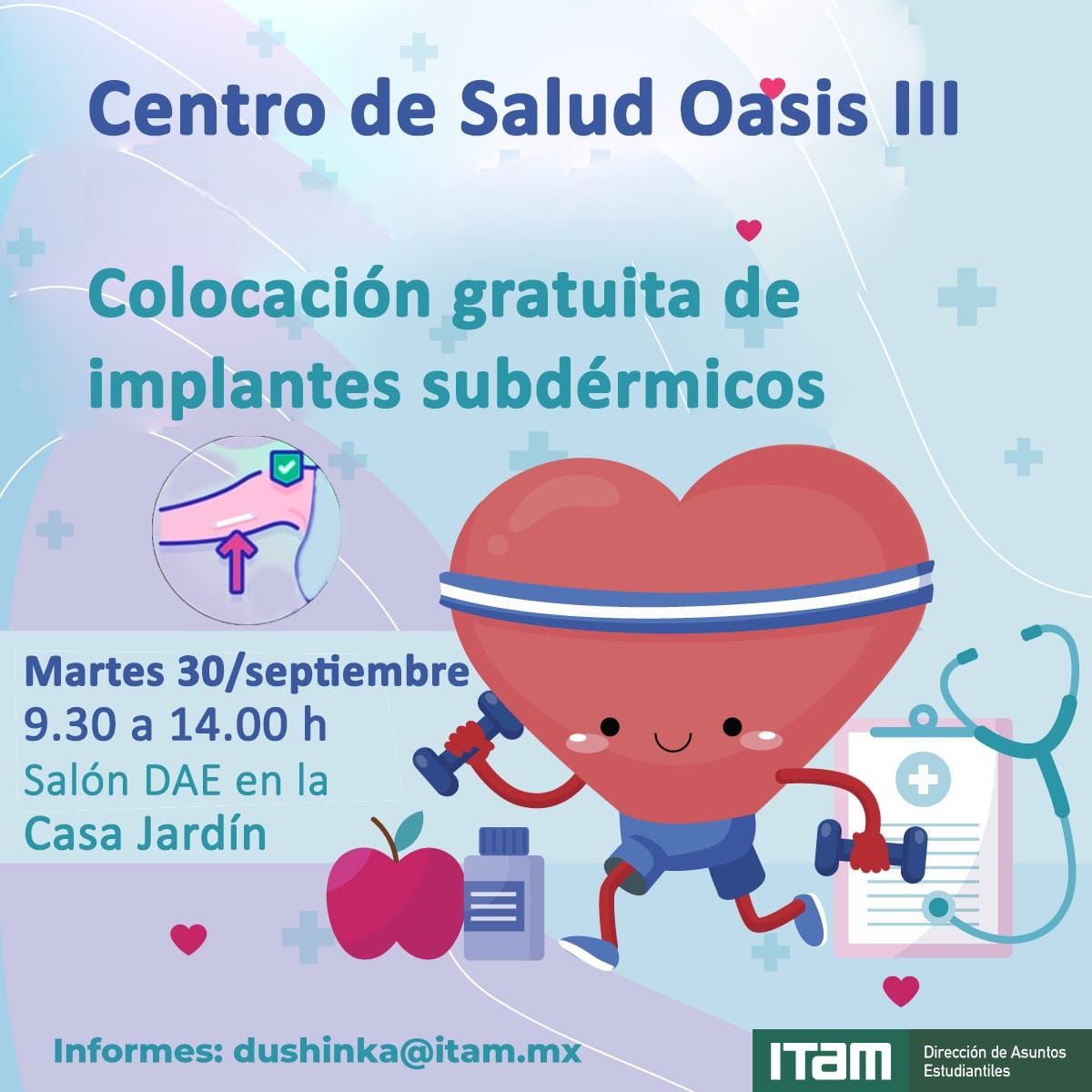 De estar interesada, acude directamente al Salón de usos múltiples de la Casa Jardín – Dirección de Asuntos Estudiantiles, en donde te estará esperando el equipo médico del Centro de Salud T-III Oasis.