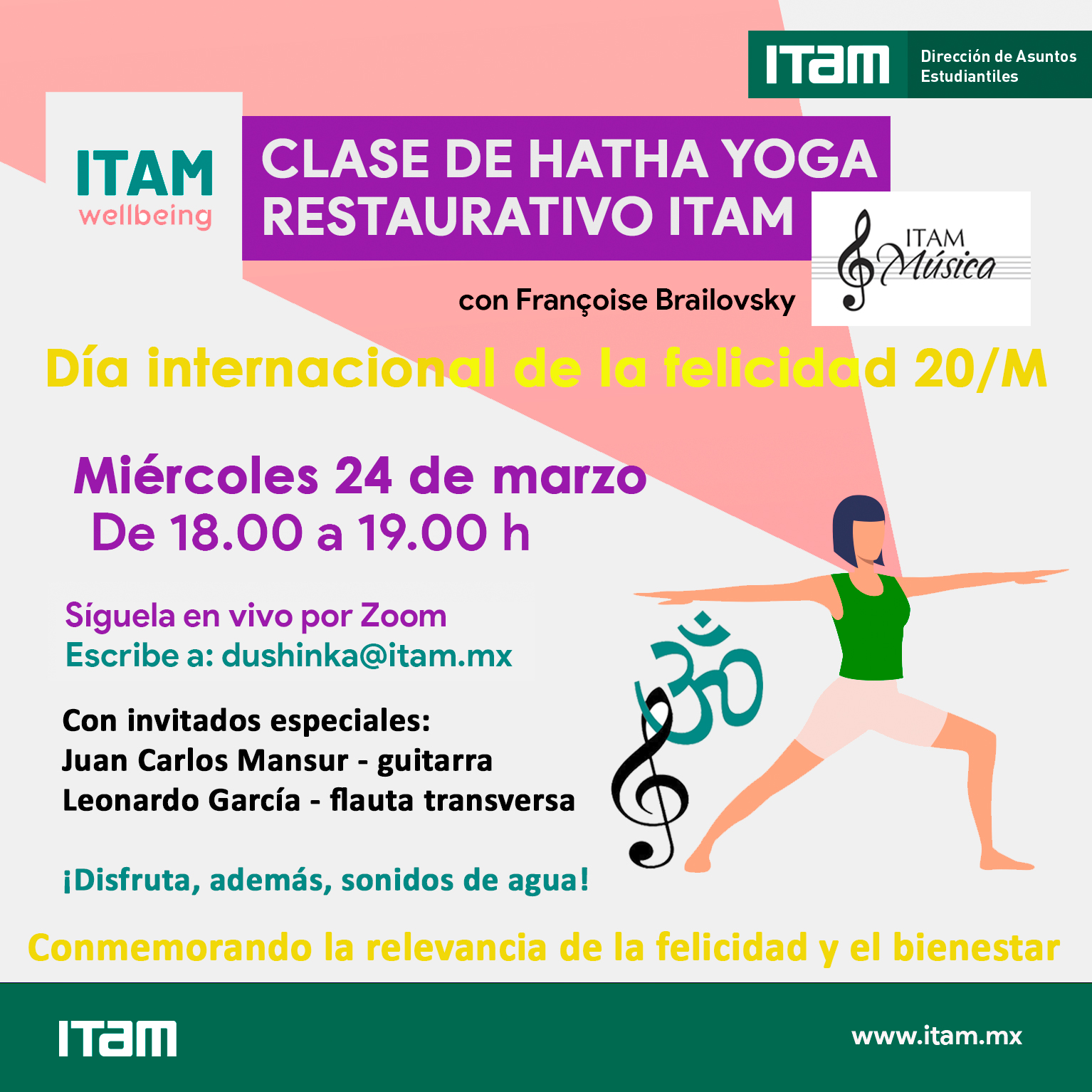 Conmemorando la relevancia de la felicidad y el bienestar, te invitamos a esta clase de Hatha Yoga Restaurativo ITAM con nuestros invitados especiales de ITAM Música:
