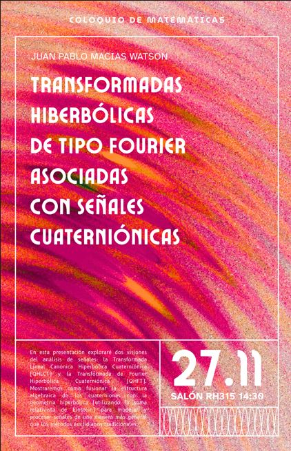 En esta presentación exploraré dos visiones del análisis de señales: la Transformada Lineal Canónica Hiperbólica Cuaterniónica (QHLCT) y la Transformada de Fourier Hiperbólica Cuaterniónica (QHFT). Mostraremos cómo fusionar la estructura algebraica de los cuaterniones con la geometría hiperbólica (utilizando la suma relativista de Einstein) para modelar y procesar señales de una manera más general que los métodos euclidianos tradicionales.