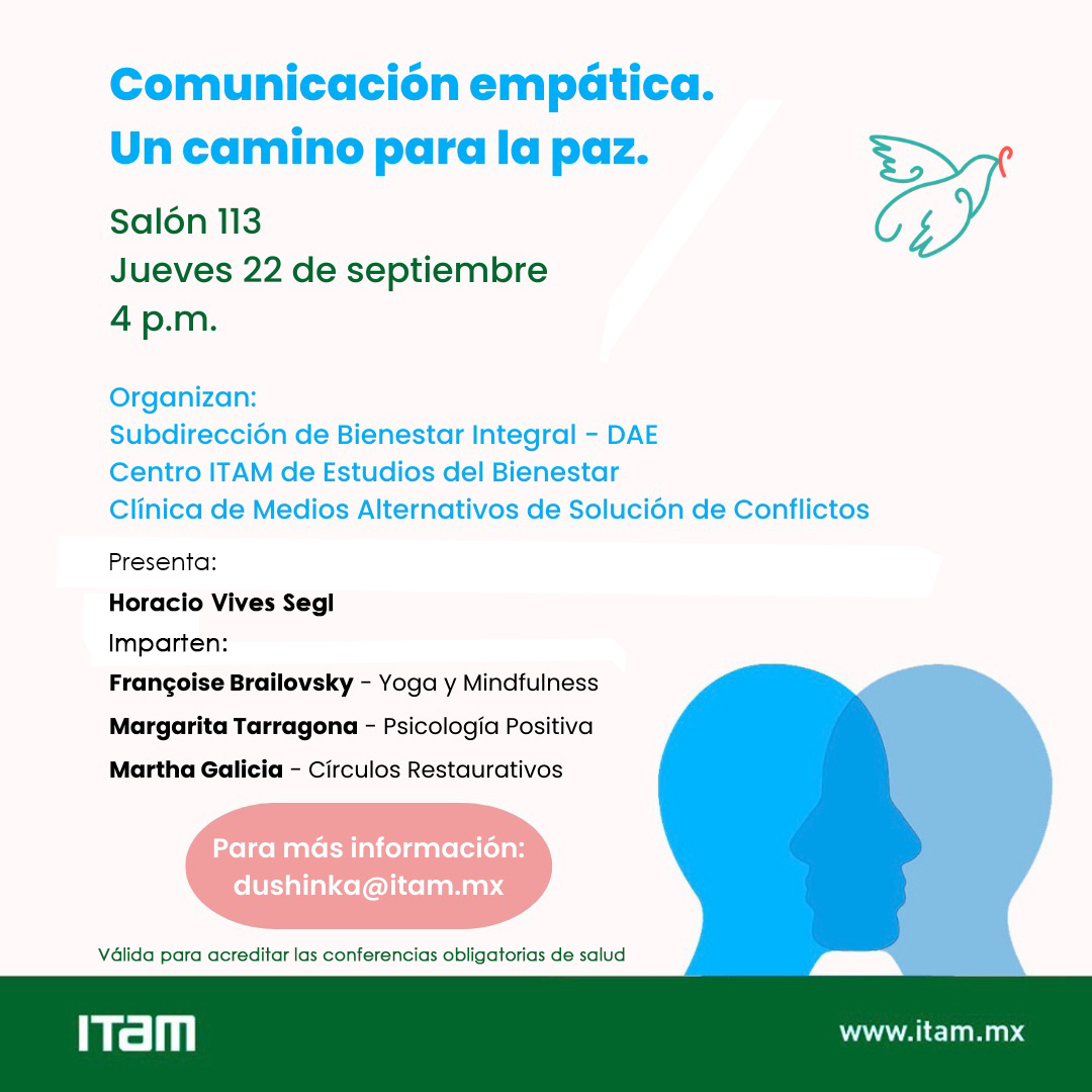 El 21 de septiembre es el Día Internacional de la Paz y para festejar la Subdirección de Bienestar Integral de la Dirección de Asuntos Estudiantiles, el Centro ITAM de Estudios del Bienestar y la Clínica de Medios Alternativos de Solución de Conflictos te ofrecen este taller: