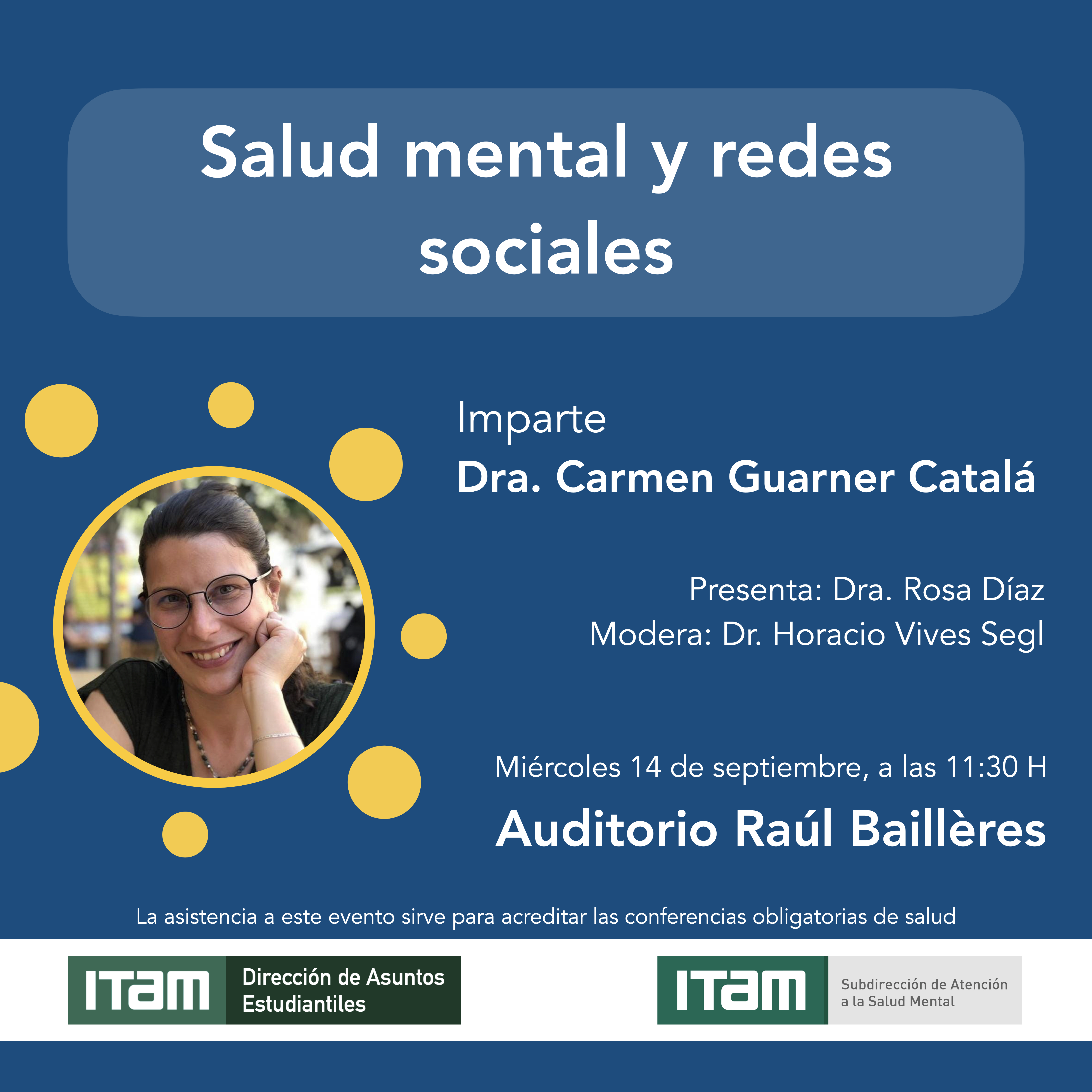 La Dirección de Asuntos Estudiantiles invita a la Conferencia de Salud "Salud mental y redes sociales", impartida por la Dra. Carmen Guarner Catalá, con la presentación de la Dra. Rosa Díaz. Modera: Dr. Horacio Vives.