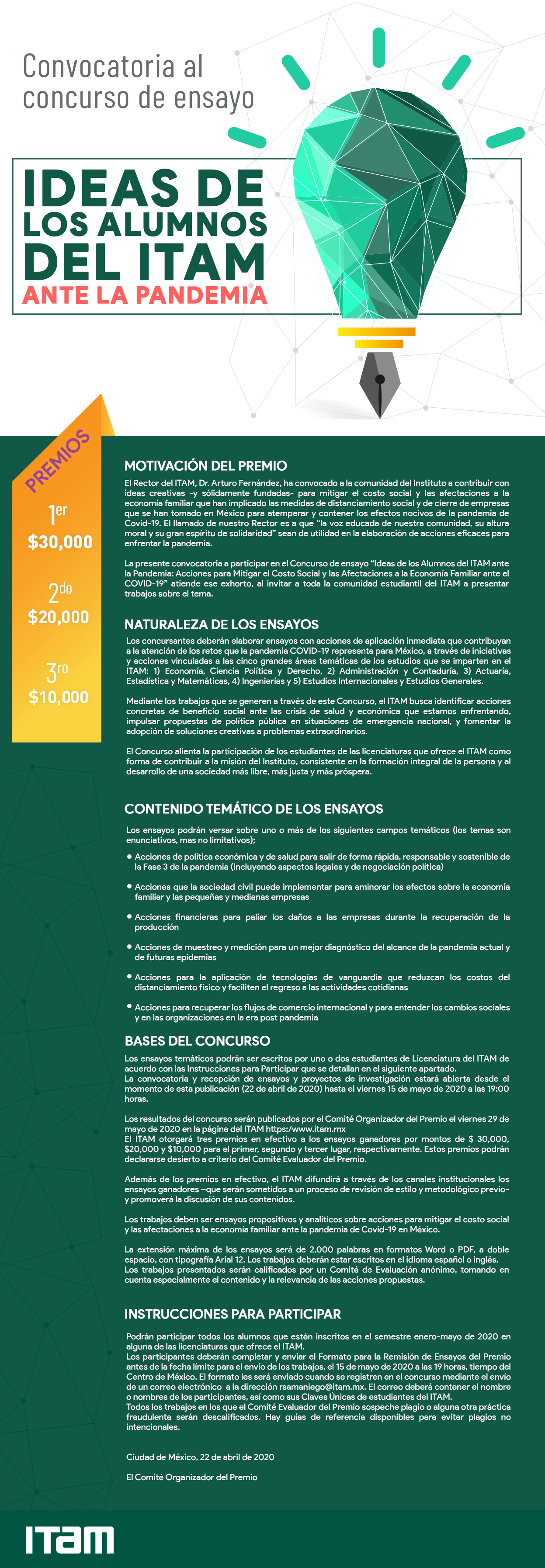 La presente convocatoria a participar en el Concurso de ensayo “Ideas de los Alumnos del ITAM ante la Pandemia: Acciones para Mitigar el Costo Social y las Afectaciones a la Economía Familiar ante el COVID-19” atiende ese exhorto, al invitar a toda la comunidad estudiantil del ITAM a presentar trabajos sobre el tema.