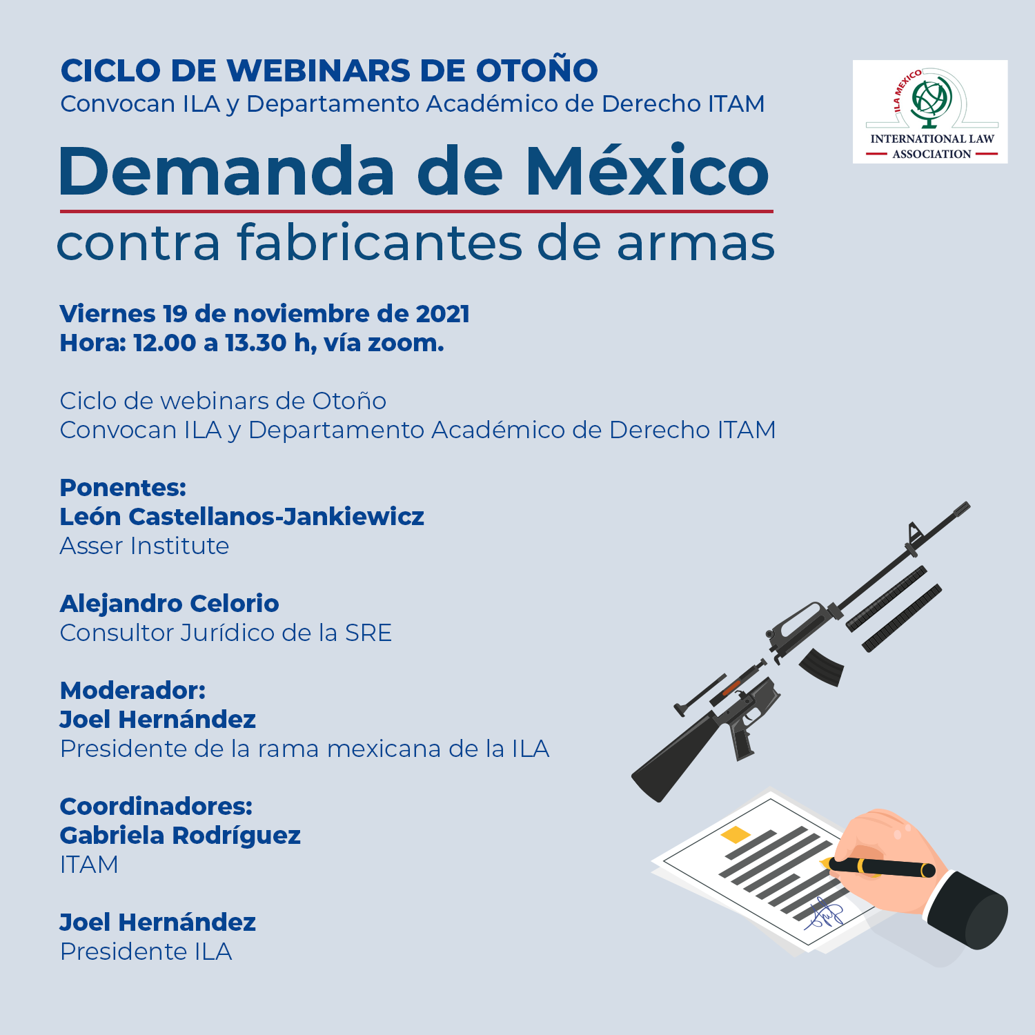 Como parte del Ciclo de webinars de Otoño, organizado entre el Departamento Académico de Derecho del ITAM y la International Law Association, nos complace invitarlos a la conferencia vía zoom “Demanda de México contra fabricantes de armas”, que se llevará a cabo el viernes 19 de noviembre a las 12:00 hrs.