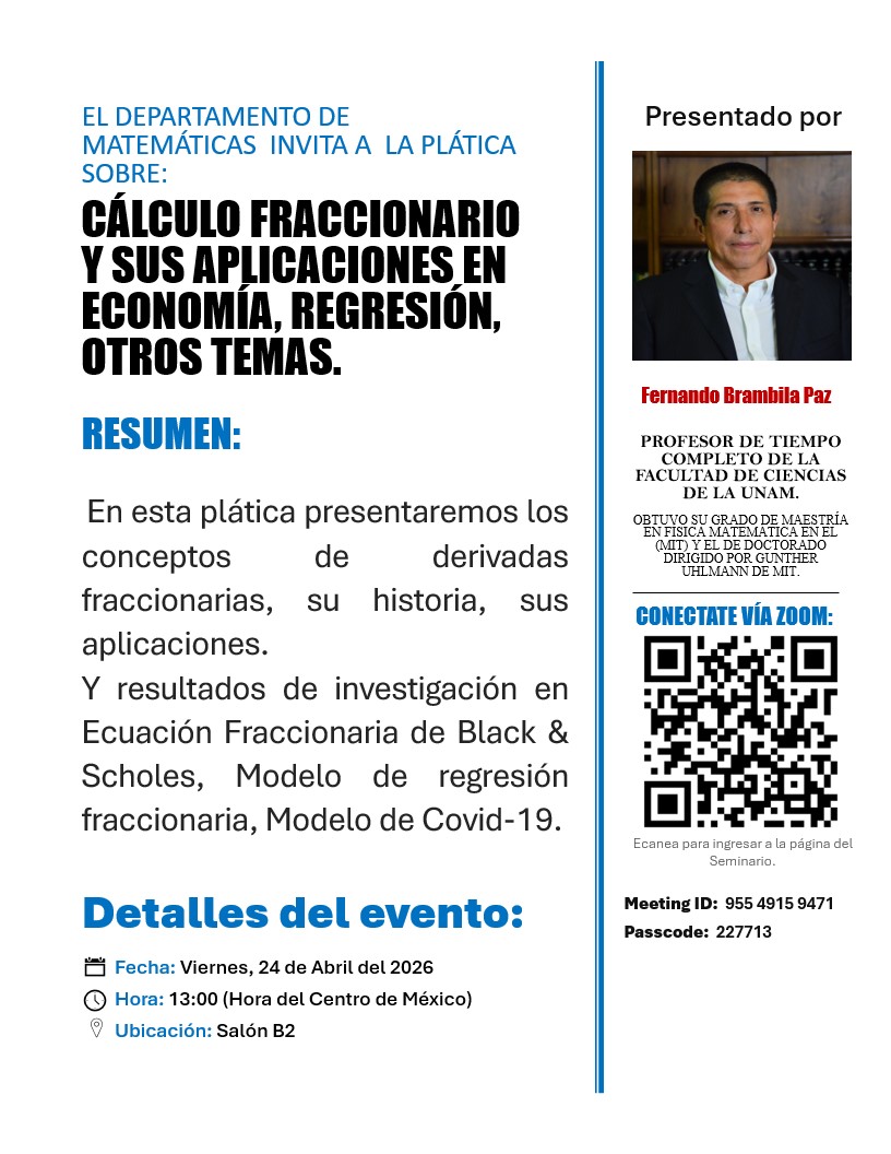 En esta plática presentaremos los conceptos de derivadas fraccionarias, su historia, sus aplicaciones. Y resultados de investigación en Ecuación Fraccionaria de Black & Scholes, Modelo de regresión fraccionaria, Modelo de Covid-19.