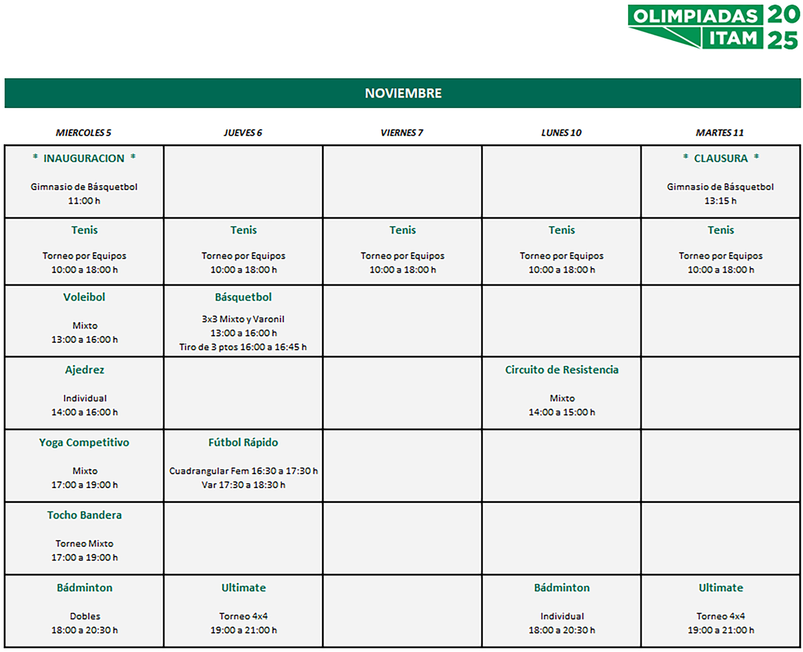 La Dirección de Asuntos Estudiantiles, a cargo del Dr. Horacio Vives, a través de la Subdirección de Bienestar Integral y de la Coordinación Deportiva les invitan a la Inauguración de las Olimpiadas ITAM 2025, cuarta edición.