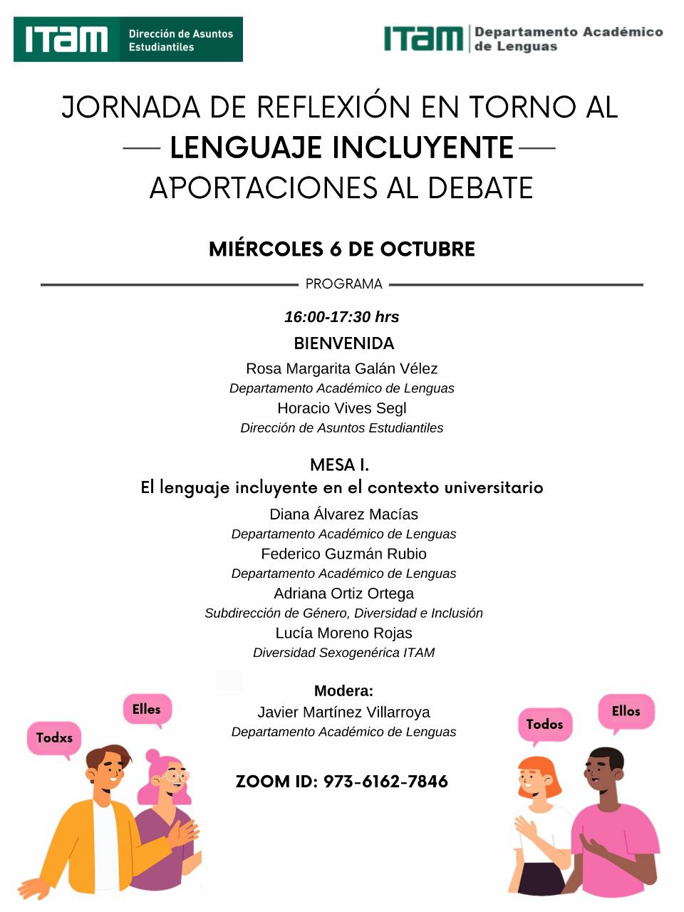 El Departamento Académico de Lenguas y la Dirección de Asuntos Estudiantiles extienden la más cordial invitación a la "Jornada de reflexión en torno al lenguaje incluyente. Aportaciones al debate", en la que se llevarán a cabo dos mesas de debate.