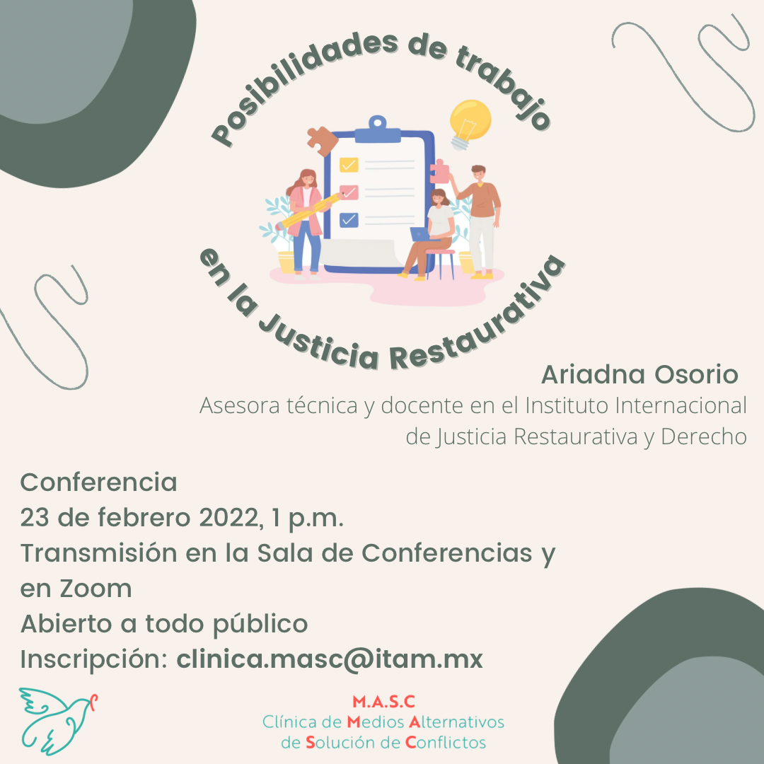 Como parte de las actividades de la Semana de la Justicia Restaurativa de la Clínica de Medios Alternativos de Solución de Conflictos, acompáñanos el miércoles 23 de febrero de 13:00 a 14:00 en la Sala de Conferencias del ITAM. Se transmitirá también por Zoom. Si requieres la liga por favor indícalo en tu correo.