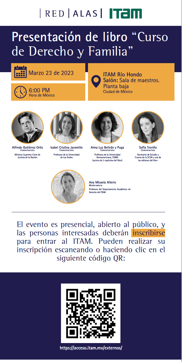 El Departamento Académico de Derecho y Red Alas se complacen en invitarlos a la presentación del libro "Curso de Derecho y Familia" que se llevará a cabo el 23 de marzo a las 18:00 hrs. en Sala de Maestros planta baja.