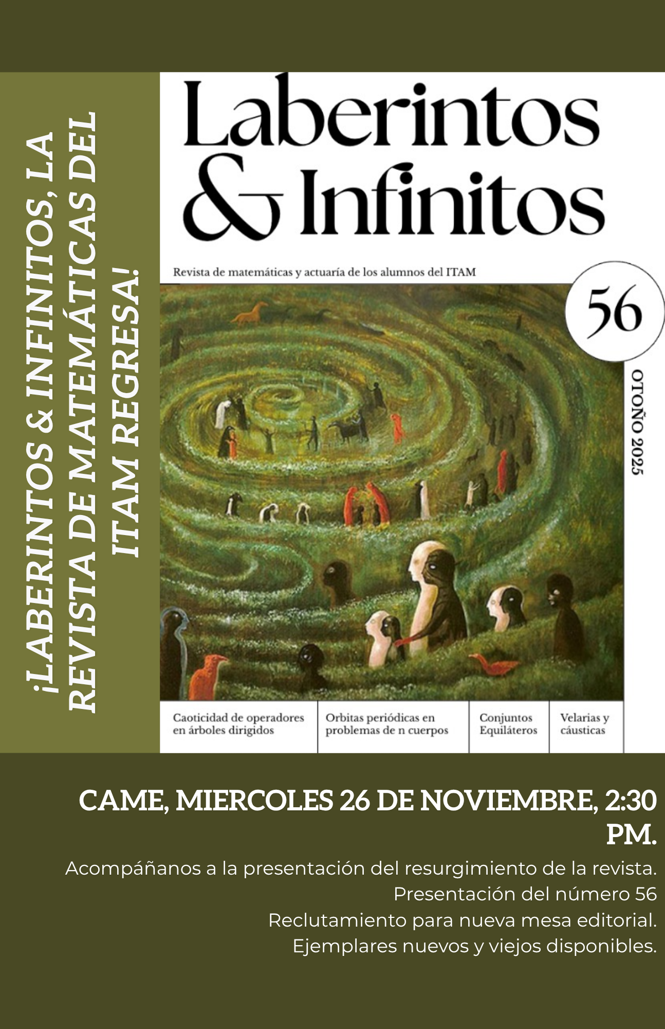 Es con mucho gusto que les invitamos a la publicación del número 56 de la revista Laberintos & Infinitos este martes 26 de noviembre en el CAME a las 2:30.