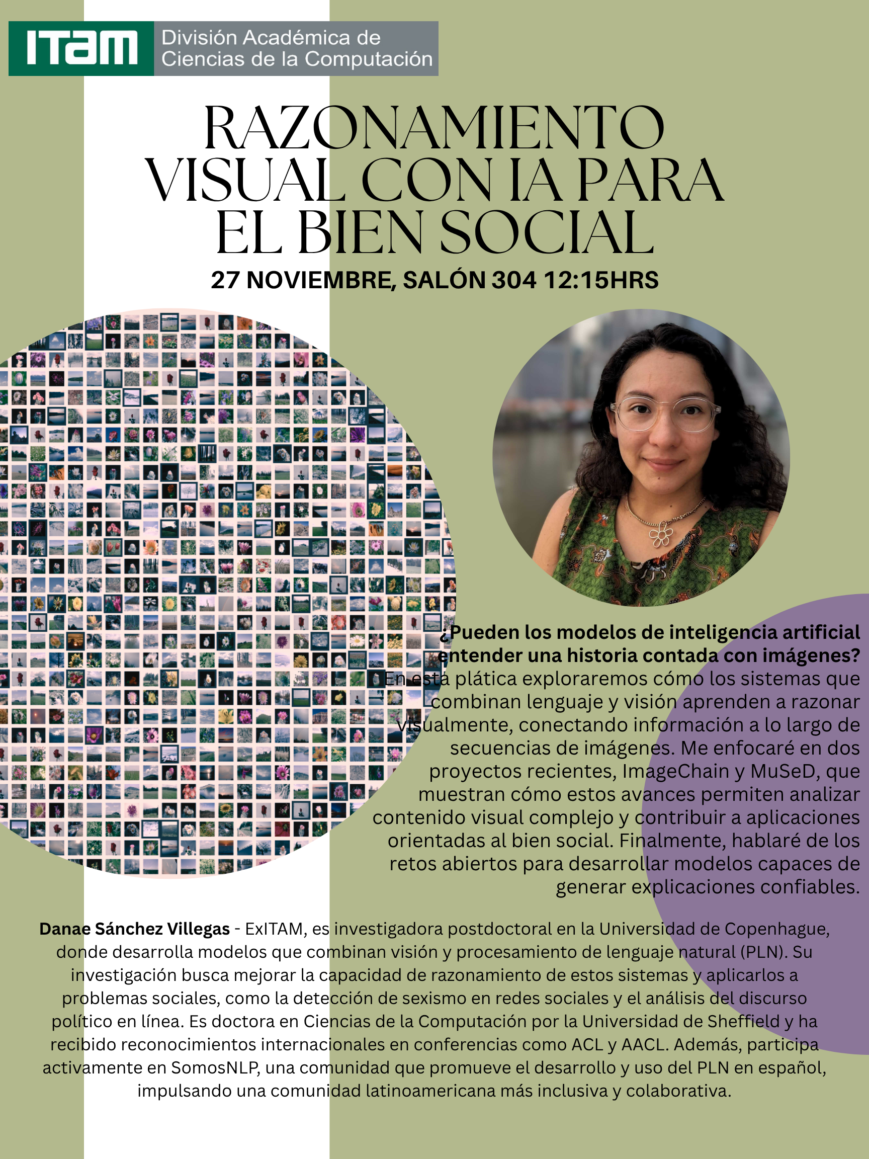 En esta plática exploraremos cómo los sistemas que combinan lenguaje y visión aprenden a razonar visualmente, conectando información a lo largo de secuencias de imágenes. Me enfocaré en dos proyectos recientes, ImageChain y MuSeD, que muestran cómo estos avances permiten analizar contenido visual complejo y contribuir a aplicaciones orientadas al bien social. Finalmente, hablaré de los retos abiertos para desarrollar modelos capaces de generar explicaciones confiables.