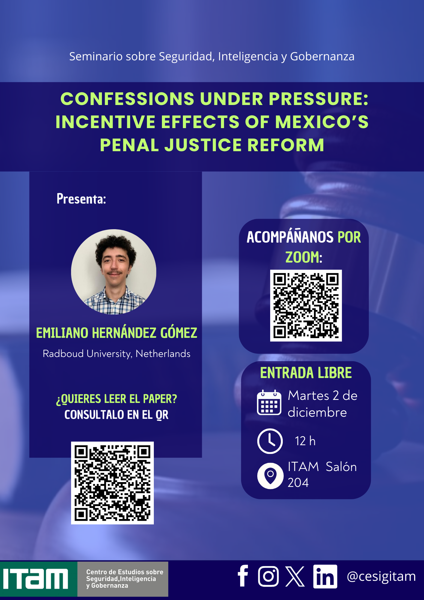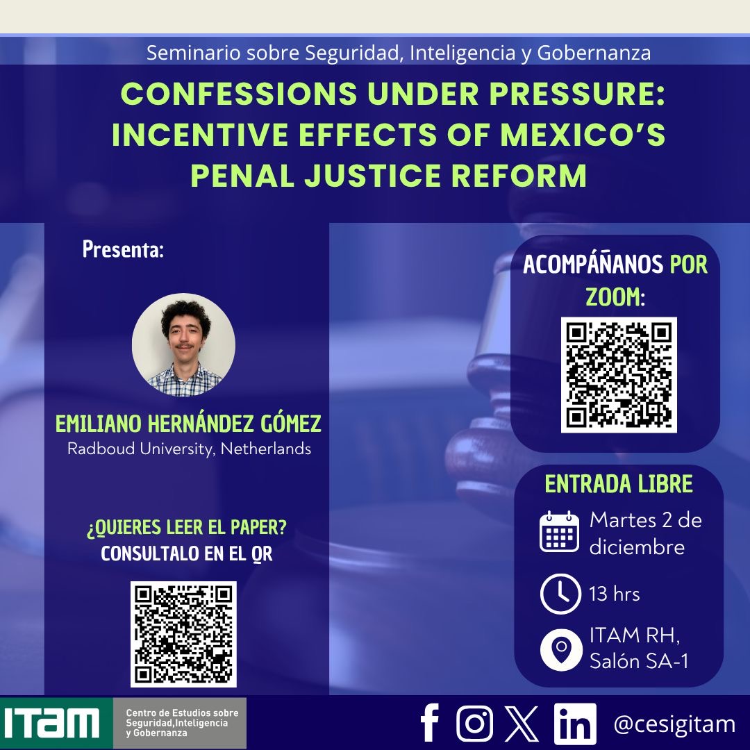En este evento, Emiliano Hernández, candidato a doctor en Economía en la Universidad de Radboud, presentará su paper Confessions Under Pressure, en el que analiza cómo las confesiones obtenidas bajo coerción se han convertido en una práctica recurrente dentro del sistema penal mexicano, impulsada por incentivos institucionales que debilitan el debido proceso y afectan la legitimidad de la justicia. El trabajo ofrece una mirada crítica sobre estas dinámicas y sus implicaciones para los derechos humanos y la reforma del sistema penal en México.