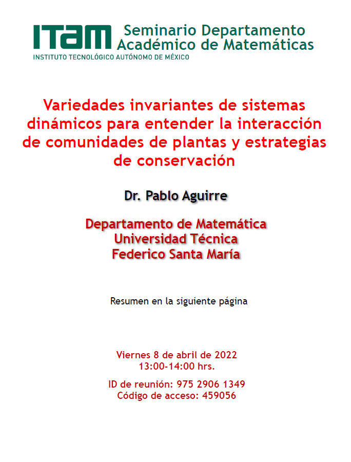 En esta ocasión nos acompaña el Dr. Pablo Aguirre, con la plática titulada "Variedades Invariantes de sistemas dinámicos para entender la interacción de comunidades de plantas y estrategias de conservación". El Dr. Aguirre es profesor del Departamento de Matemática de la Universidad Técnica Federico Santa María, Valparaíso, Chile.