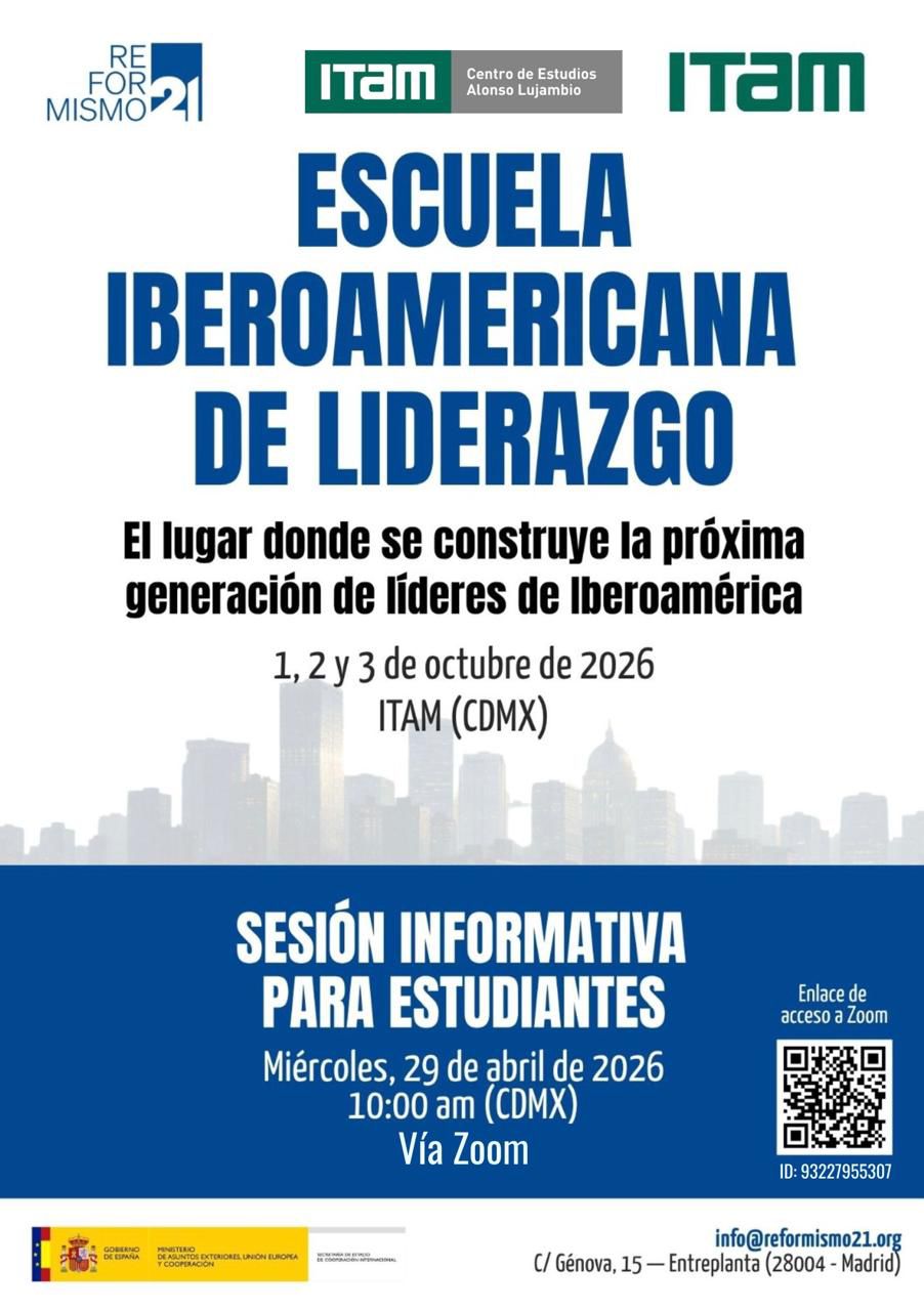 Sesión informativa en Zoom para estudiantes del ITAM por parte de la Escuela Iberoamericana de Liderazgo para recibir información sobre un curso de formación que tomará lugar en las instalaciones del ITAM durante los días 1, 2 y 3 de octubre de 2026. La sesión informativa será el día 29 de abril de 2026 a las 10:00 hrs CDMX.