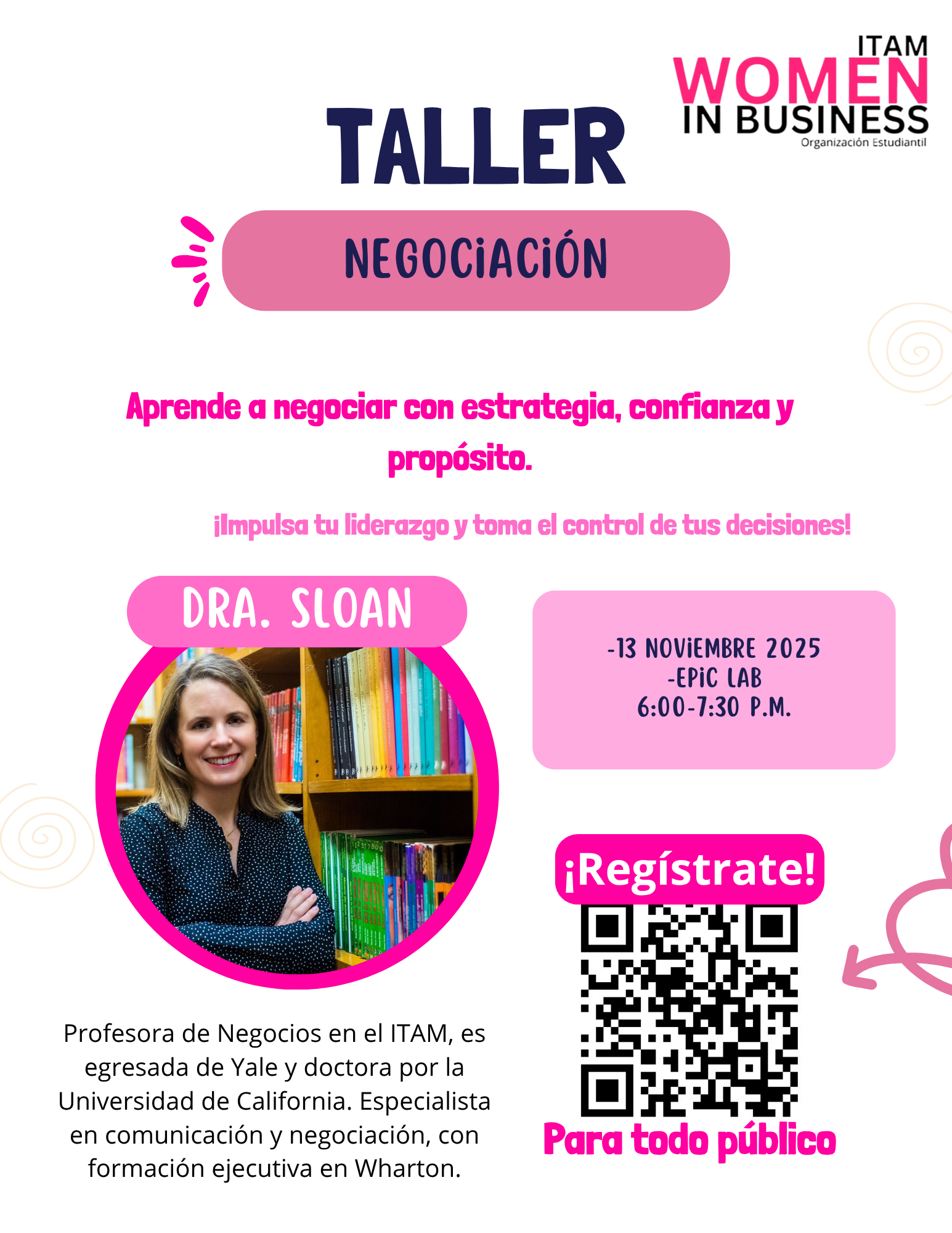 Únete al Taller de Negociación organizado por ITAM Women in Business y aprende con la Dra. Sloan cómo comunicarte con estrategia, confianza y propósito.