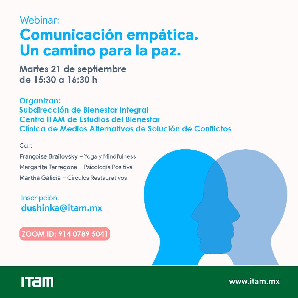 El 21 de septiembre es el Día Internacional de la Paz y para festejar la Subdirección de Bienestar Integral de la Dirección de Asuntos Estudiantiles, el Centro ITAM de Estudios del Bienestar y la Clínica de Medios Alternativos de Solución de Conflictos te ofrecen este webinar.