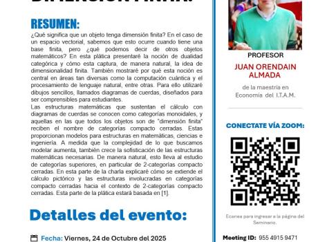 ¿Qué significa que un objeto tenga dimensión finita? En el caso de un espacio vectorial, sabemos que esto ocurre cuando tiene una base finita, pero ¿qué podemos decir de otros objetos matemáticos? En esta plática presentaré la noción de dualidad... [+]