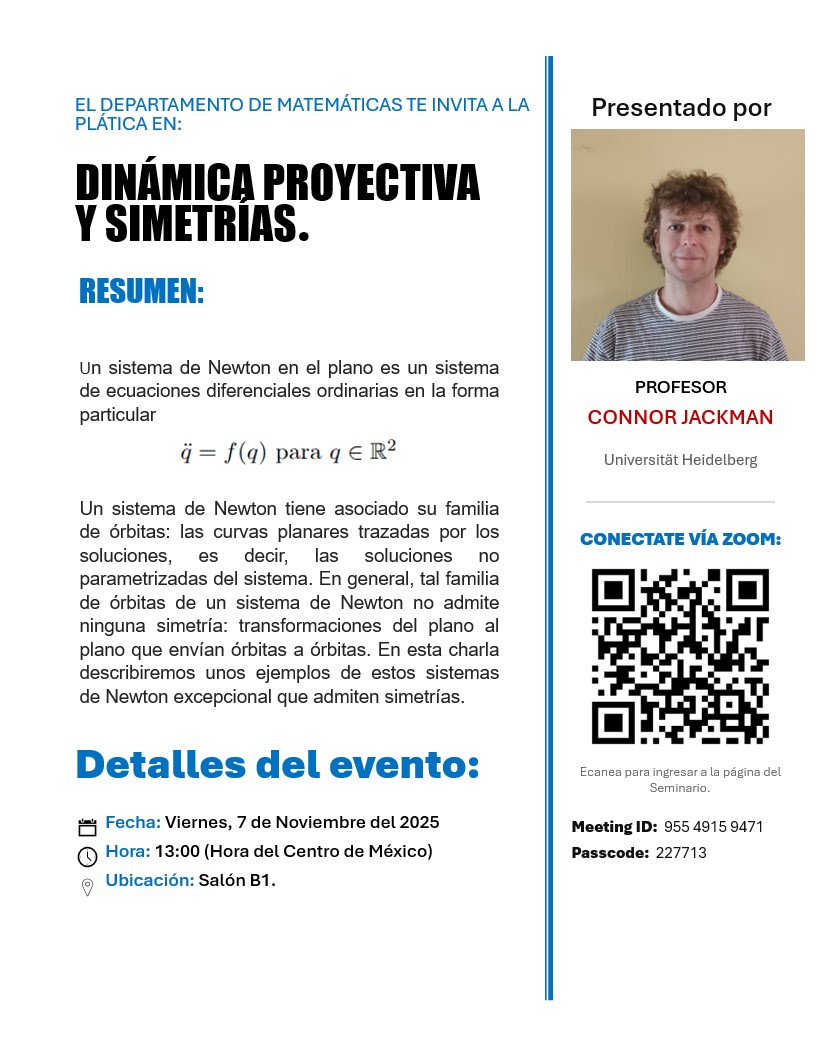 Un sistema de Newton en el plano es un sistema de ecuaciones diferenciales ordinarias. Un sistema de Newton tiene asociado su familia de órbitas: las curvas planares trazadas por los soluciones, es decir, las soluciones no parametrizadas del sistema. En general, tal familia de órbitas de un sistema de Newton no admite ninguna simetría: transformaciones del plano al plano que envían órbitas a órbitas. En esta charla describiremos unos ejemplos de estos sistemas de Newton excepcional que admiten simetrías.